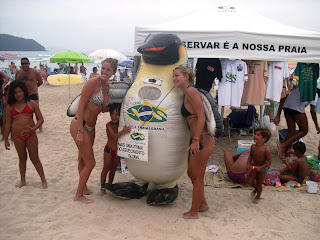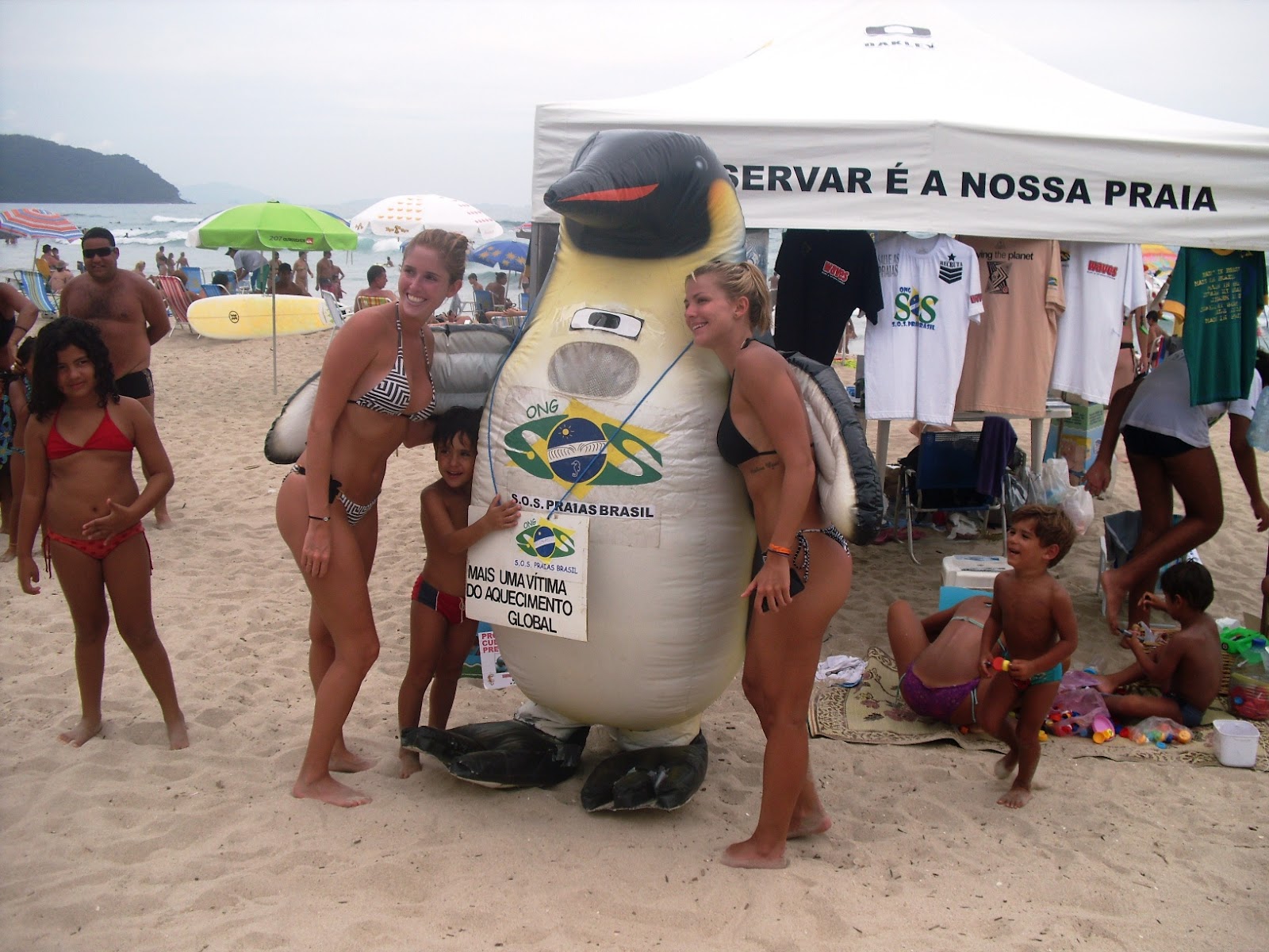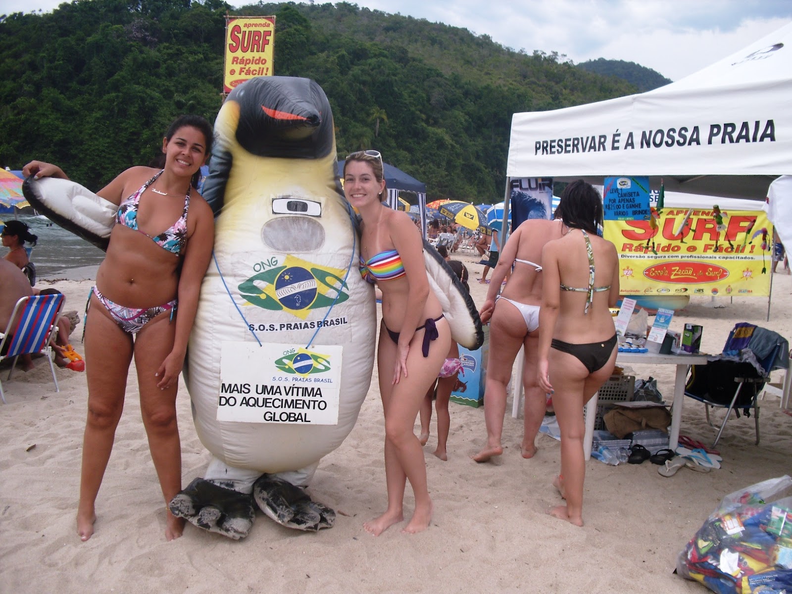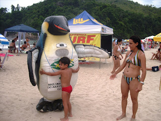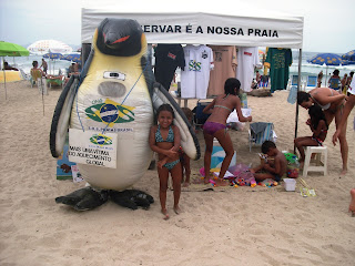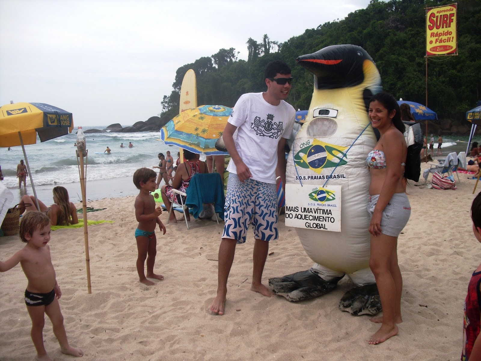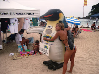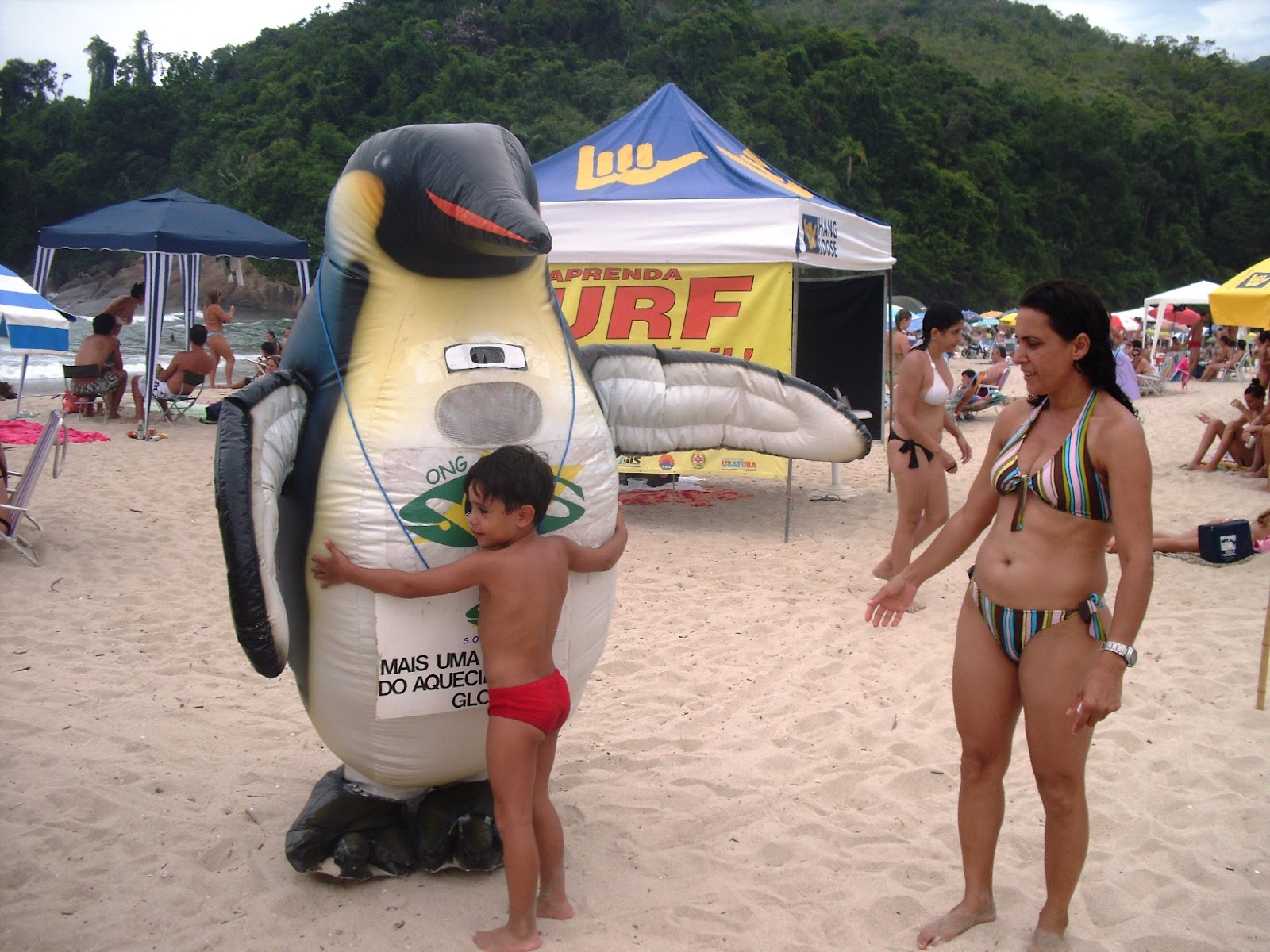 O Homem Bituca e o Pinguim Eco passearam entre os banhistas para conscientizá-los sobre a importância da preservação das praias indicando os locais para colocação correta dos lixos.