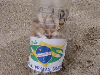 MARCELO MARINELLO RECOLHENDO EMBALAGEM DE PROTETOR DEIXADA NA PRAIA