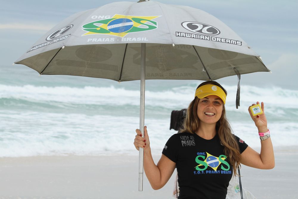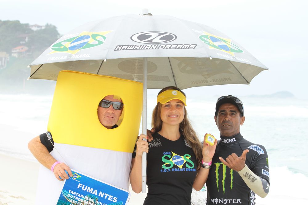 Equipe SOS PRAIAS BRASIL e banhista em apoio às ações