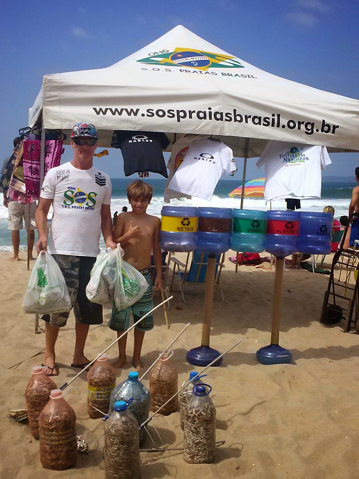 Marcelo Marinello fundador da SOS PRAIAS BRASIL e Gabriel em frente a exposição de filtros de cigarros coletados das areias das praias
